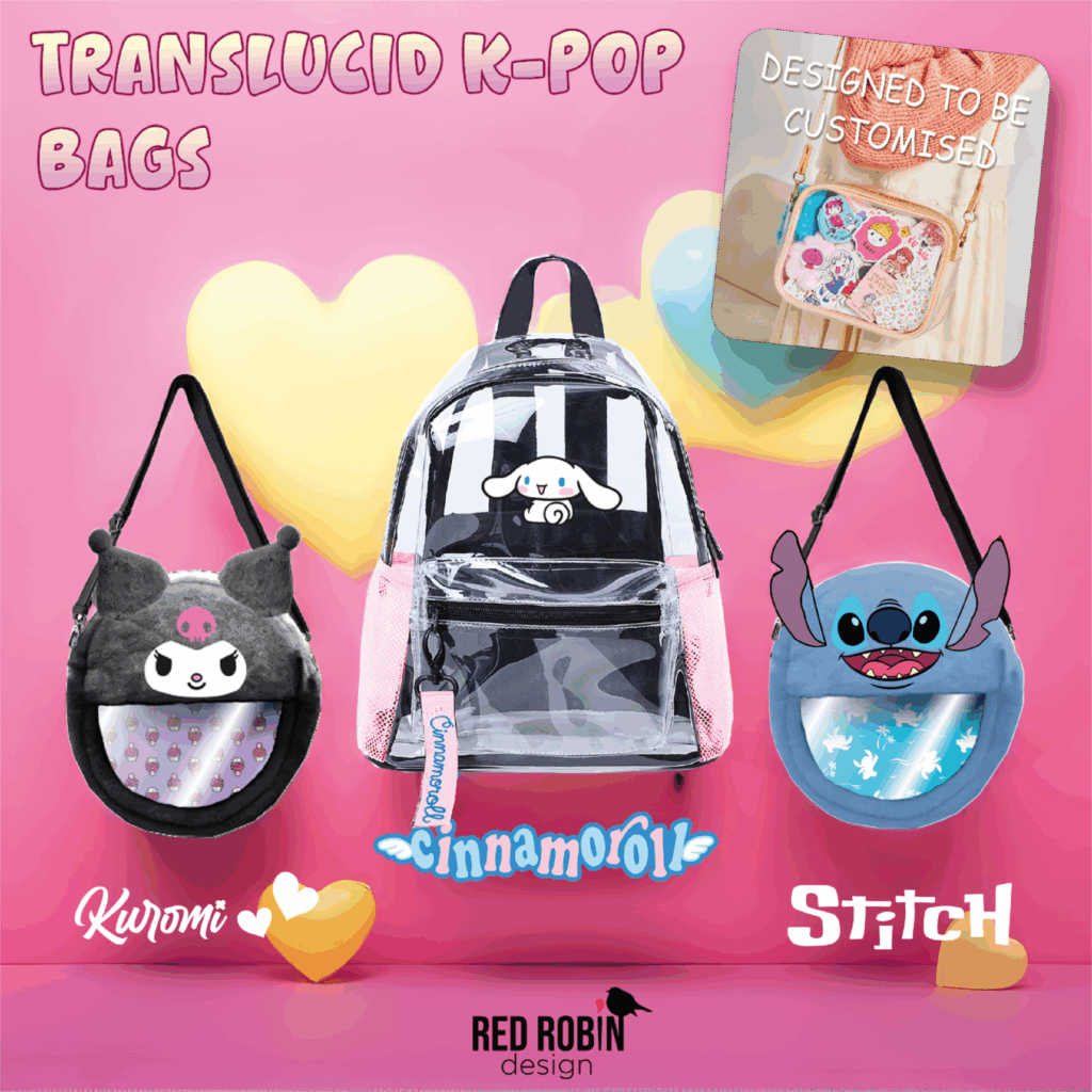 K-POP BAGS: Translucent, customizable, pure Asian street vibe – Stitch, Kuromi, Cinnamoroll, One Piece. Glow up your fit.